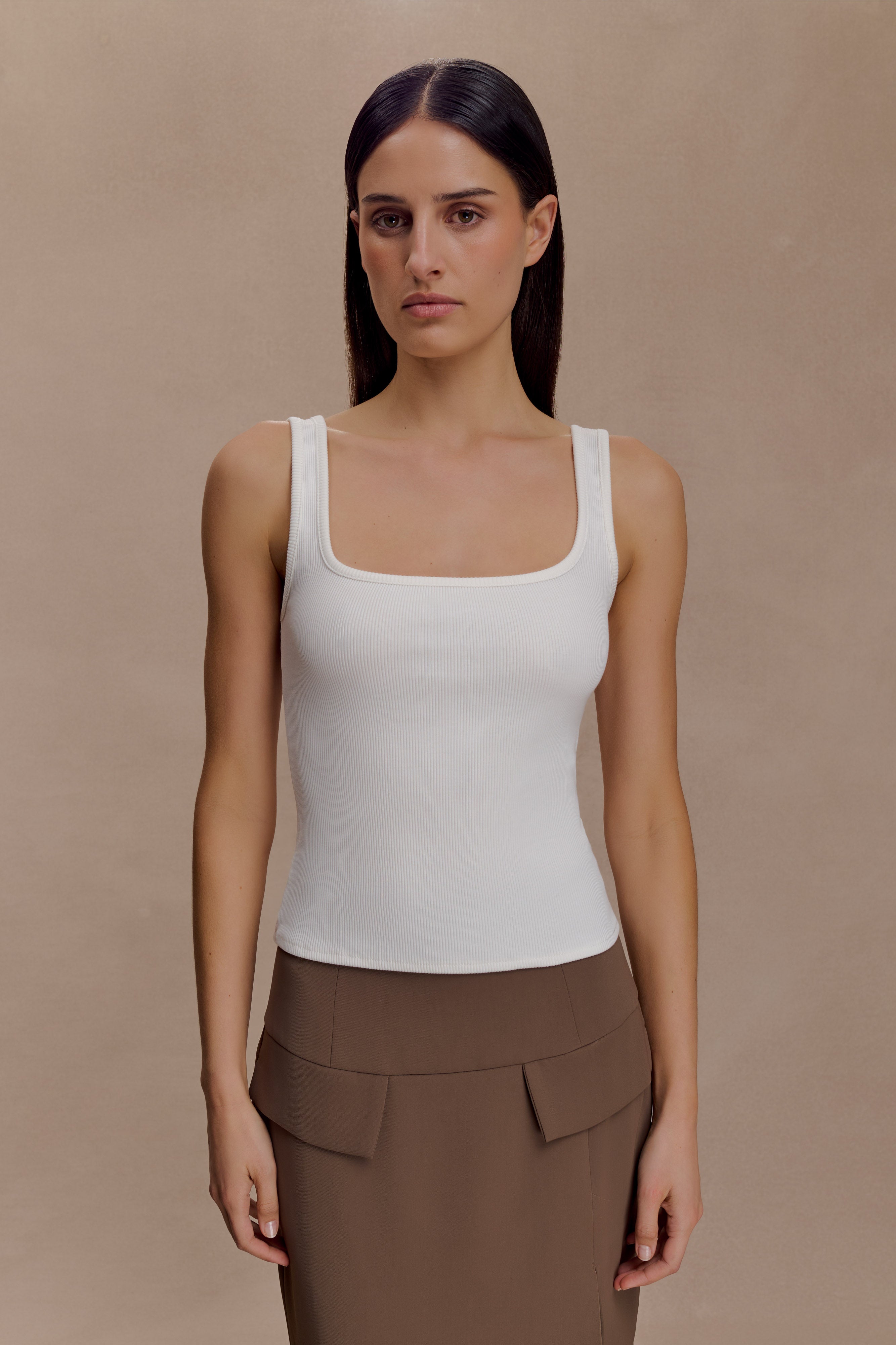 The AISLING Ribbed Square Neck Sleeveless Top is a timeless essential with a refined edge. Designed with a clean square neckline and a low back, it frames the silhouette with modern simplicity. The fitted bodice in ribbed fabrication flatters the figure, while the unlined finish keeps it lightweight and versatile. Effortlessly styled up or down, this top is a foundation piece for endless looks.